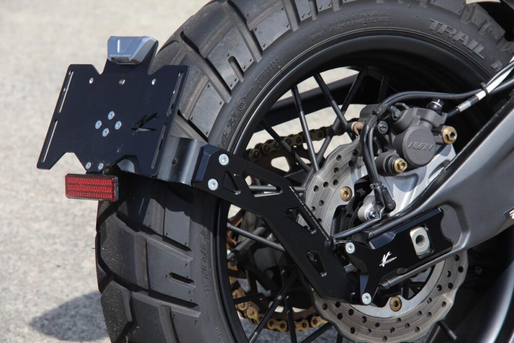 Valter Motoの無骨な作りのアルミ製スイングアーム ナンバープレートホルダーで、もともとテールカウル下に配されるナンバープレートをタイヤの後ろへと移設している。こちらも車体の雰囲気を大きく変えるのに一役買っているパーツだ。