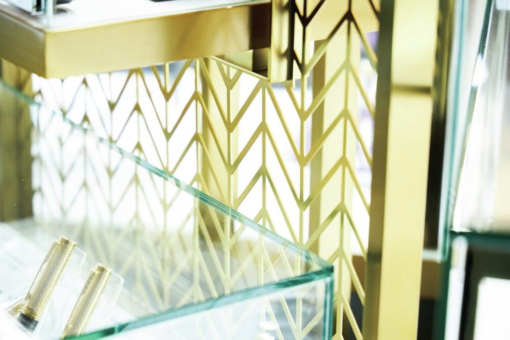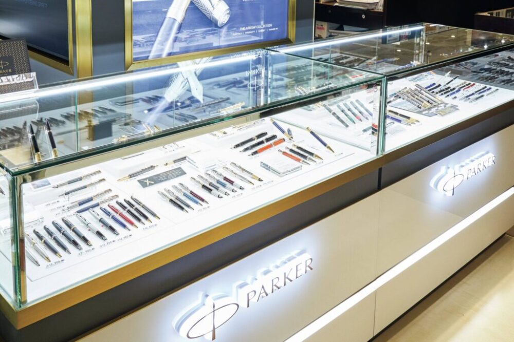 パーカーのブランドカラーである「クールグレイ」を配したショーケース。ペンが美しく見渡せるよう、ライトの明るさも微調整している。旗艦店だからこそ実現できる、豊富なラインアップが整然と並ぶ様は圧巻の光景。