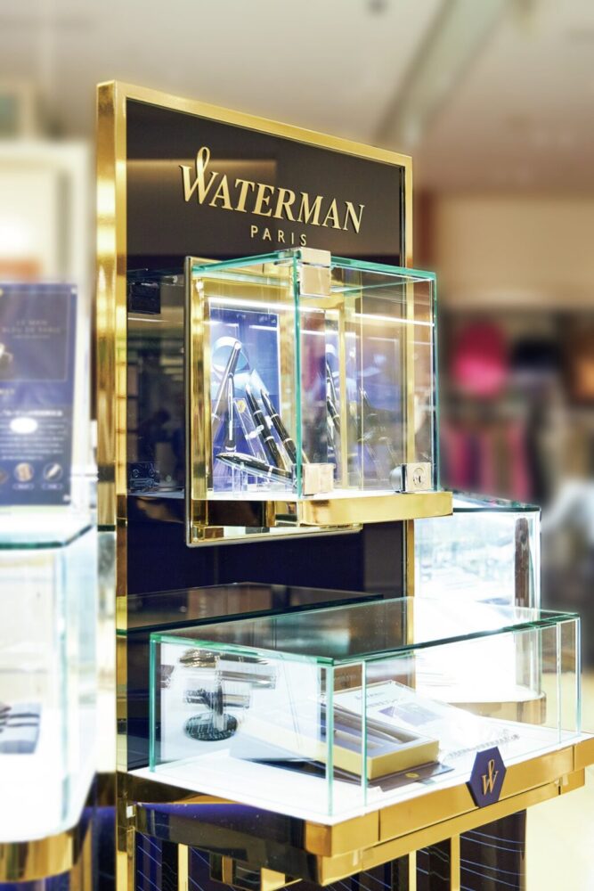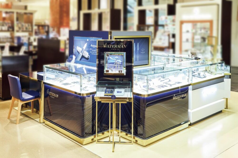 ウォーターマンコーナーは、ブランドアイデンティティを体現する深いブルーで統一された空間だ。ひときわ目を引くコーナーケースには、最新のコレクションが美しくディスプレイされており、注目のアイテムが一目で分かる。
