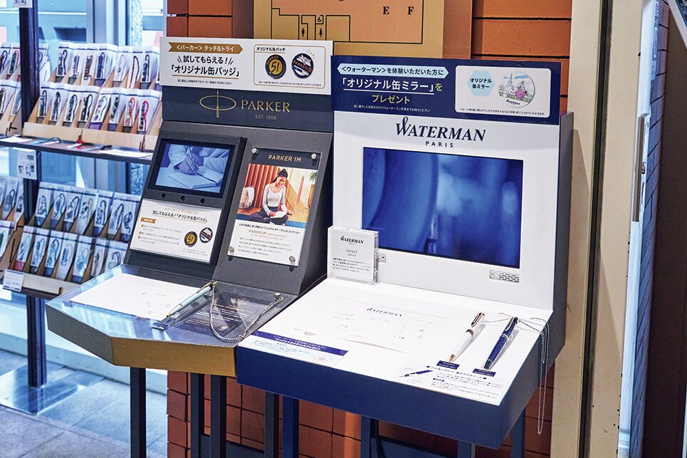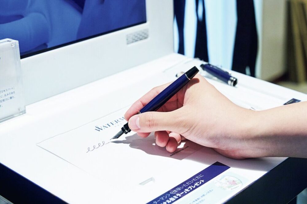 館内1~3階、書籍売り場のエスカレーター脇に目を向けると、そこには試し書きコーナーが。両ブランドのボールペンや万年筆を気軽に試せる点が嬉しい。試筆した紙を地下1階の高級筆記具売場に持参すると、嬉しいノベルティのプレゼントも。地下1階では、ビギナー向けの万年筆ワークショップなども開催される予定だ。今後のさまざまな企画にも注目したい。