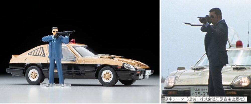 ドラマ『西部警察』に登場するスーパーZと大門圭介部長刑事(団長)を1/64スケールで立体化。団長がスーパーZ越しにショットガンを構える姿をイメージ。過去に発売されたスーパーZ(2013~2014年)の仕様とは異なり、今回は3ナンバー、サイドエンブレム無し、赤色灯有りの状態を再現。