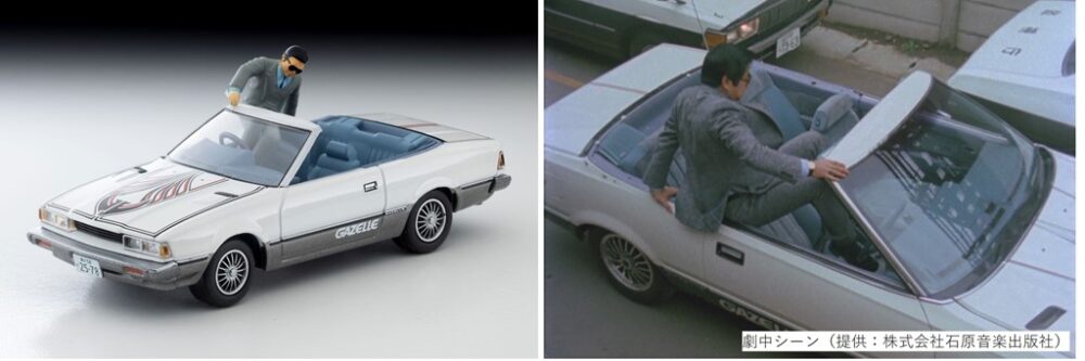 ドラマ『西部警察』に登場するガゼールと捜査課長・木暮謙三警視を1/64スケールで立体化。オープンボディに改造された木暮課長の愛車で、『PART-II』以降のオープニングで有名な飛び乗るシーンを再現。初出となる第36話の仕様を採用。純正アルミホイール、赤色灯無し、飛び乗りのためにバックレストを寝かせた運転席を特徴とする。