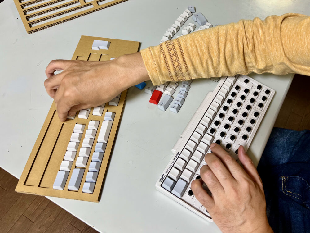 次に、無刻印キートップをセットしていく。ちなみに、箱に入った状態からどの列のキーかを混ぜないように配置していく必要がある。
