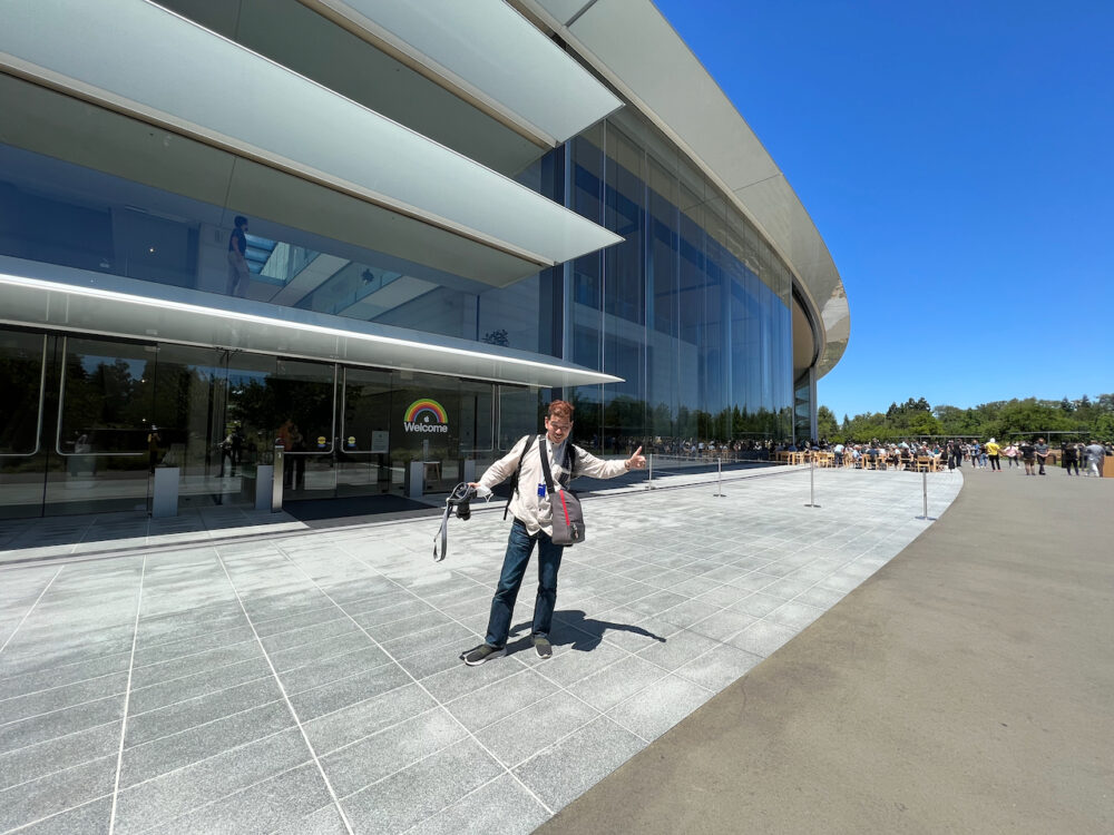 抽選で集められた少数の開発者と、メディアの一部だけを集め、密にならないように屋外が開催場所に選ばれた。Apple本社である直径約500m、4階建ての巨大建造物『Ring』の、北東側、巨大なオープンスペースとなっているレストランエリアから外側の広場に向かう場所に特設ステージを作り、最初にティム・クック、次にクレイグ・フェデリギが実際に登壇。オンラインで世界に向けて、公開されたWWDCのKeynote動画を見た。