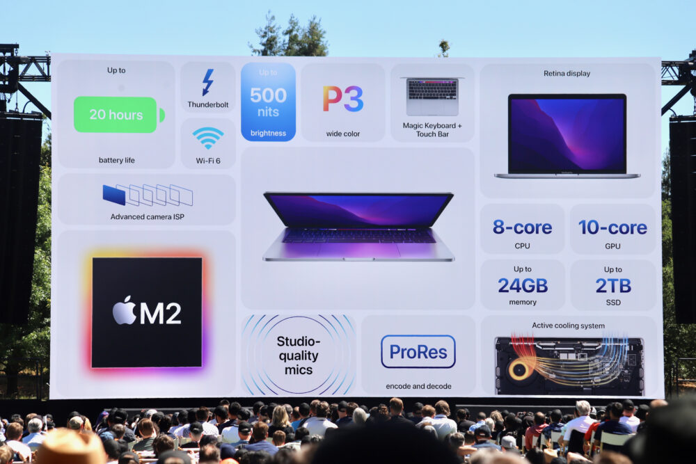 M2は第2世代の5nmプロセスの技術で生産される。チップセットの基本的な性能は、前モデルのM1に対して、CPUで18%、GPUで35%、ニューラルエンジンで40%、メモリー帯域が50%大きい。