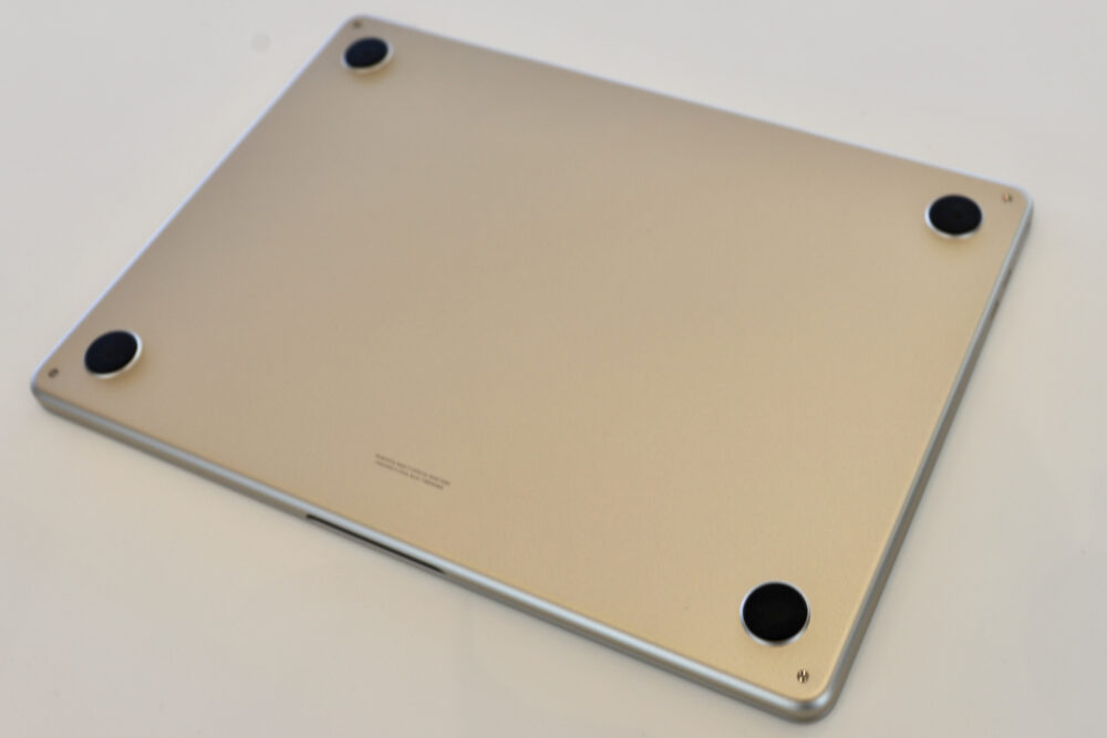 裏の足はMacBook Pro 14/16と同じ、アルミ切削部分が出っ張ったタイプ。これも内部構造をフラットにするためだろう。ネジは四隅だけ。従来のMacBook Airは10本のネジを使っているし、現行MacBook Pro 14/16も8本だ。4本だけでいいというのは、構造的に何か工夫があるのかもしれない。