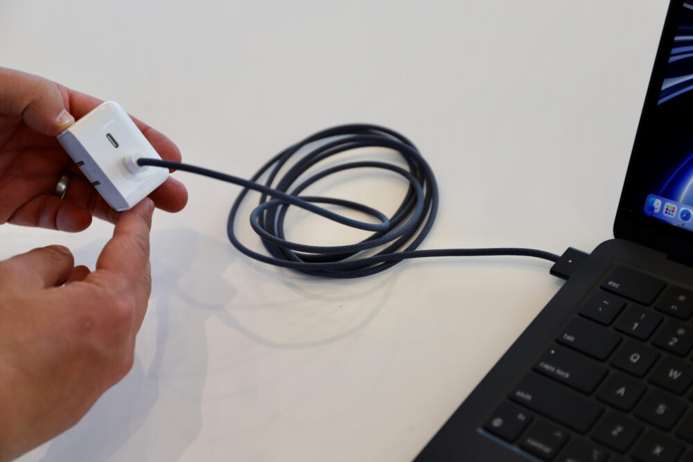 MagSafeの電源ケーブルは4色のボディカラー(後述)同色のものが同梱される。USB-C側のコネクターは唐突に白い。スタッフの方に聞くと、そこは電源アダプターの方に合わせてあるのだという。なるほど。