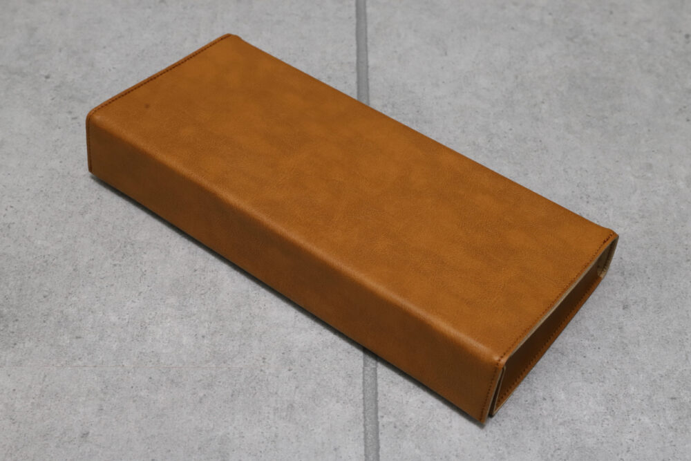 表地は日本製の高級人工皮革。本体色は写真のキャメルとホワイトの2色があり、ごらんのように自然な模様が入ってるので、一見天然皮革風。裏面はスエードのような人工起毛皮革を使用しており、HHKBを柔らかくホールドしてくれる。