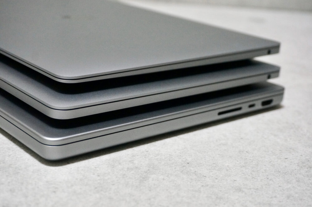左から、M1 MacBook Air、M2 MacBook Pro 13インチ、M1 Pro MacBook Pro 14インチ。実際、日々持ち歩いてみると、14インチモデルはかなり厚くて重い。今にして思うと、2016年から続くMacBook Pro 13インチは薄くて軽いのだ。