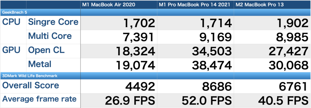 マルチコアは高性能コアのコア数(M1 Proは多い)が影響する部分だが、それでもM2はM1 Proに肉薄する数字をたたき出している。