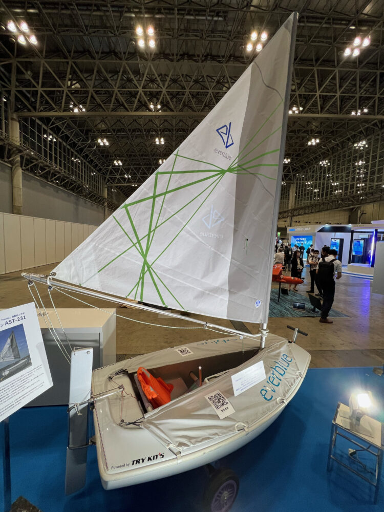 まずこちら。『Hansa』というオーストラリア製のひとり乗りの帆船に、エバーブルーが作った自動操船化ユニット『eb-NAVIGATOR2.0』『eb-CONNECT』を組み合わせて誰でも簡単に操船者なしの自動航行船として運用できるようにした『AST-231』。