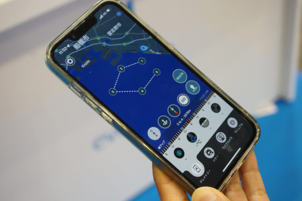 iPhoneアプリ『eb-CONNECT』の画面上で、目的地をタップすれば、『eb-NAVIGATOR2.0』が風向きと風の強さから帆を操作して、目的地に向かう。人間が乗ることもできるし、帆走の知識がまったくなくても、iPhone上で目的地をタップするだけで、海上を風力だけを使って移動することができる。
