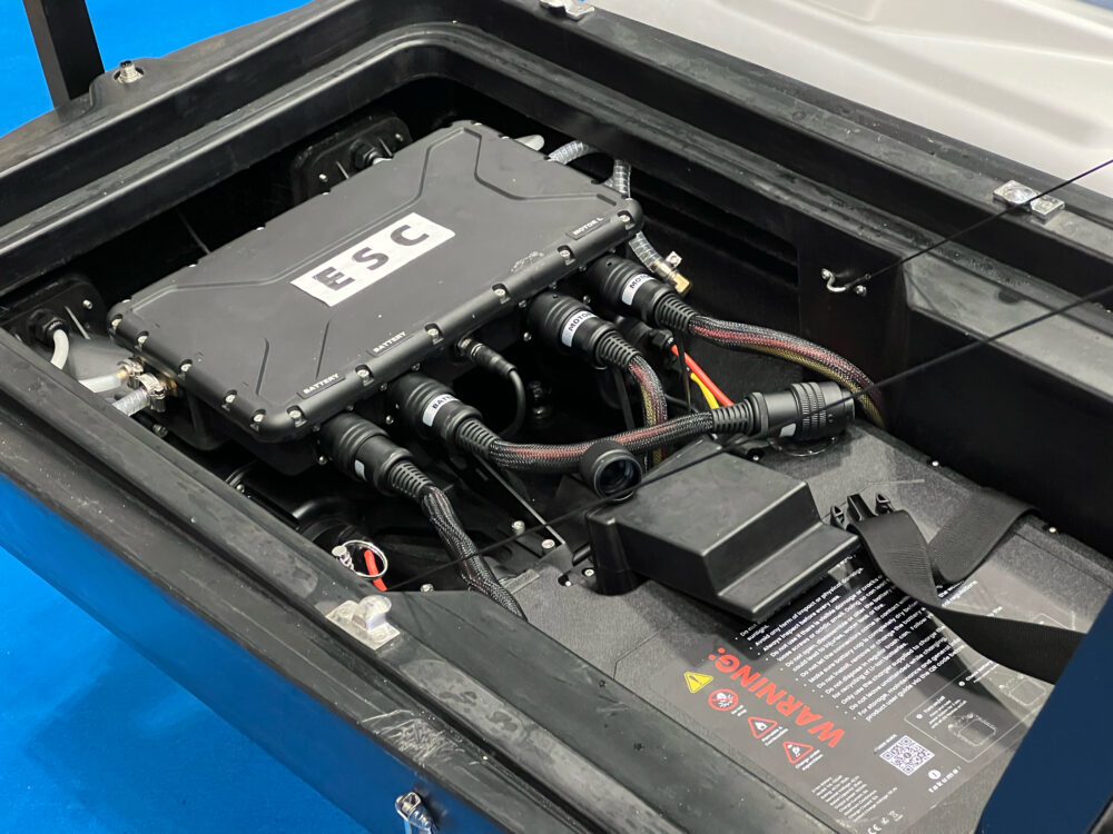 バッテリーは48V 35Aを搭載し、本体の全長は1.8m。船体重量57kg、装備重量90kg。