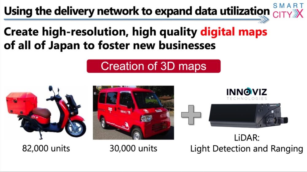 これは、日本郵便が普段走らせている8万2000台のスクーター、3万台の車両にLiDARを搭載してデータを取得しようというもの。