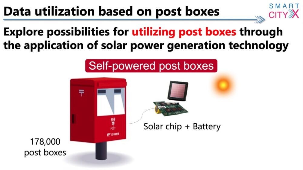 続いて、今度は、Sol Chipと日本郵便の取り組み。こちらは、全国に17万8000個ある郵便ポストにソーラーバッテリーと小さなセンサーとコンピュータを取り付けて情報収集をしていくというもの。
