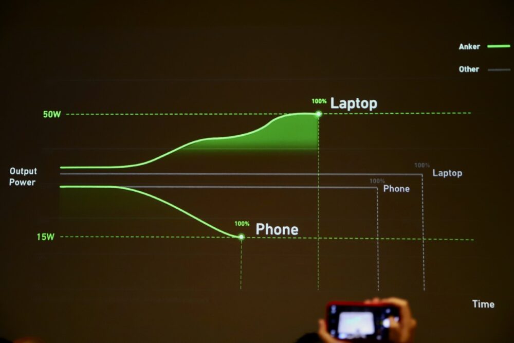 たとえば、例として表示されたグラフに添っていえば、ラップトップとスマホを同時に充電しつつ、スマホが満充電に近くなって必要とする電力が少なくなると、インテリジェントにラップトップ側への供給電力を増やしていくことができる。