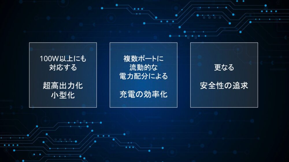 GaN Primeには大きな3つの特徴がある。ひとつはまず超高出力化と小型化を両立させ、さらに100W以上にも対応すること。回路構造の最適化を行い、小サイズを実現。エネルギー効率は94.1%になるという。