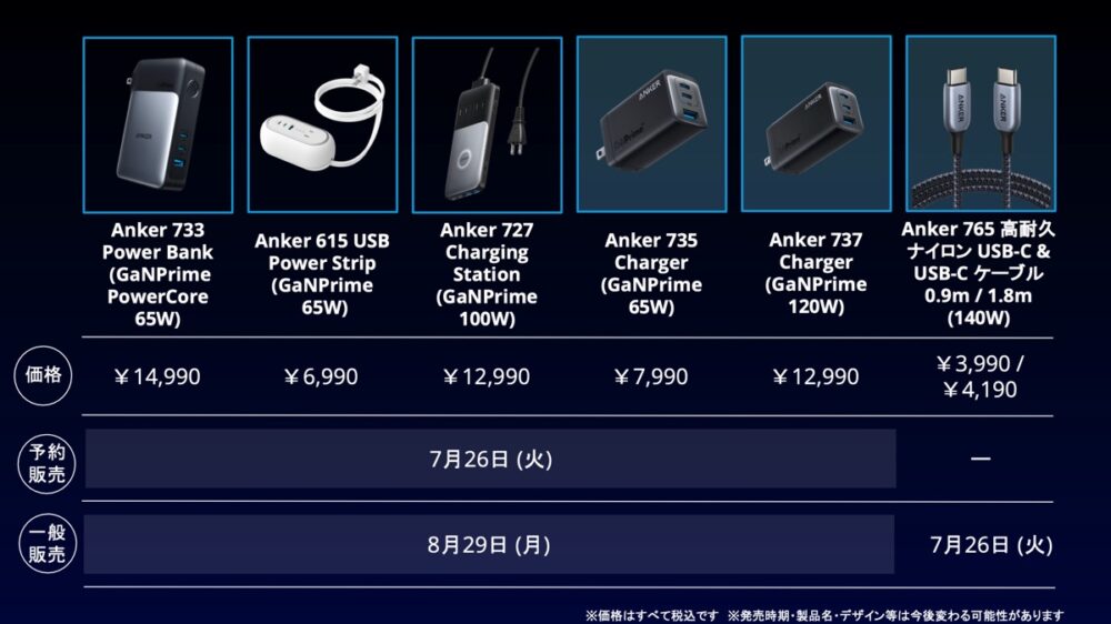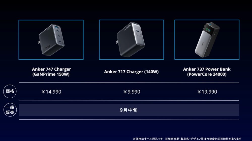 3ポート150W充電が可能なAnker 747 Chargerと、1ポートで140Wを供給可能なAnker 717 Charger、140W出力が可能な24,000mAhバッテリーAnker 737 Power Bankの3製品は9月中旬に販売。
