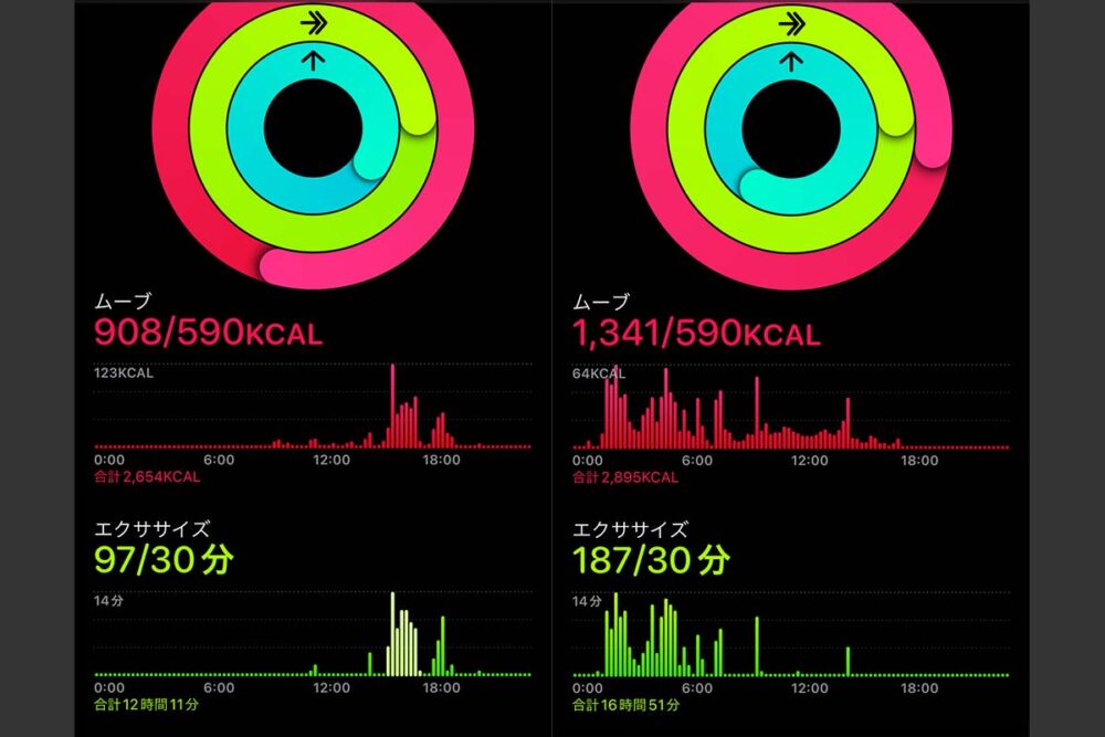 というのを前提して、5合目を出発して7合目まで登った日と、早朝に起きて登頂し、5合目まで降りた日のアクティビティアプリはご覧の通り。