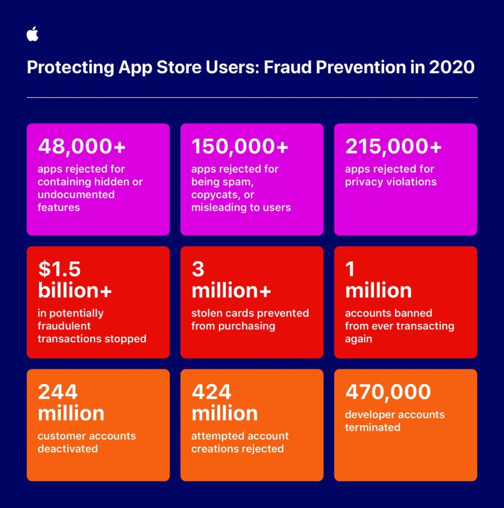 iPhoneのアプリ審査は、厳格で差し戻しが多いことでアプリ開発者には不評だが、たとえば2020年には、隠れた機能を搭載していたということで約4万8000本のアプリが登録を却下された。約15万本のアプリが、スパムやコピーキャット(既存のアプリの模倣品)、ユーザーに誤解させることを目的としているとして登録を阻止されている。さらに約9万5000本のアプリが不正行為を理由に却下されたが、そのほとんどに『おとり商法』の仕組みが盛り込まれていた。