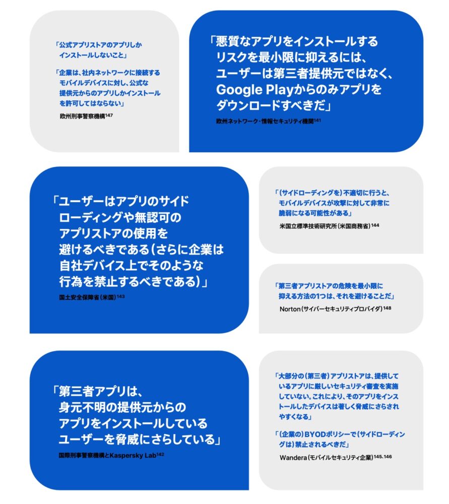 各国のセキュリティ関連の機構も、スマホのアプリは公式のアプリストアからインストールすることを推奨している。にもかかわらず、同じ政府の他の部門がうかつにサイドローディングを推奨するような意見を述べるとはどういうことなのか?