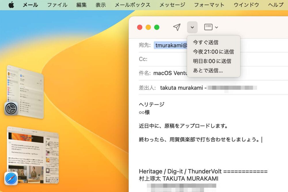 『今夜21:00に送信』というのは(たとえ、すでに友達と飲みに行っていたとしても)夜遅くまで頑張って仕事をしています……という雰囲気を醸し出すための設定だろう(笑)『明日8:00に送信』であれば、相手が朝一番に見て返事をくれるかもしれない。
