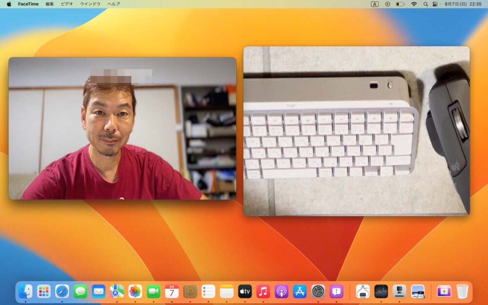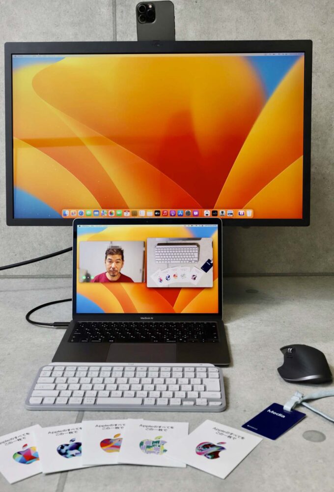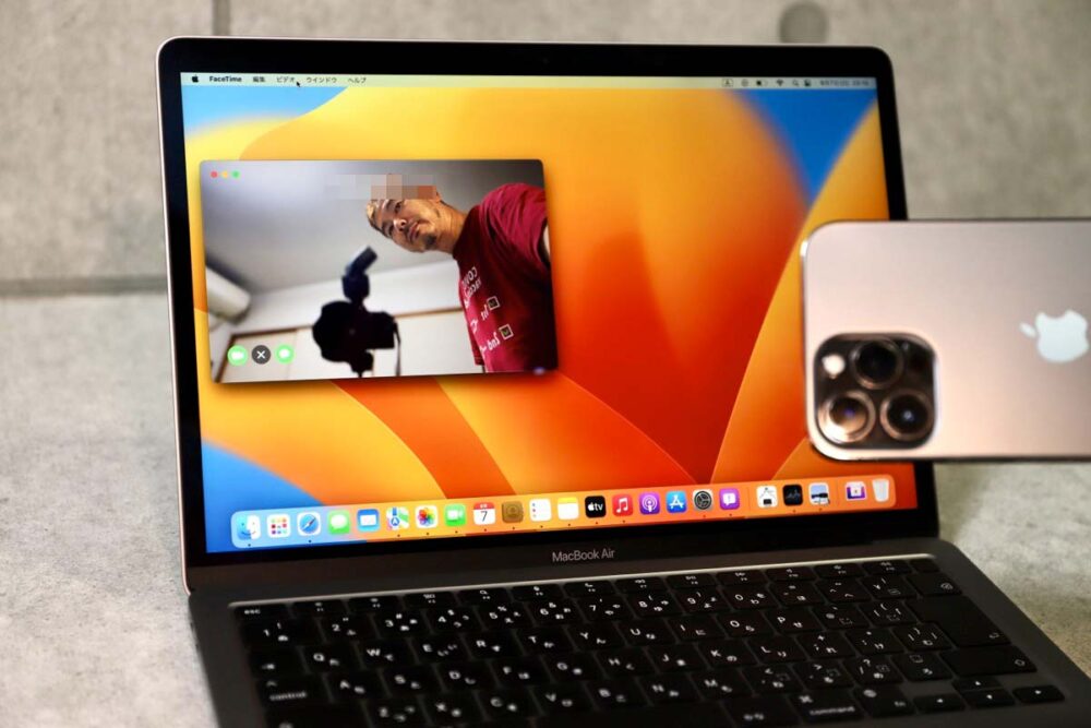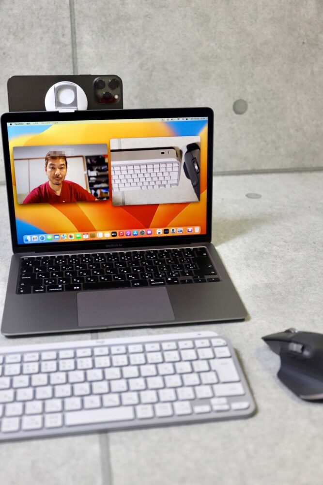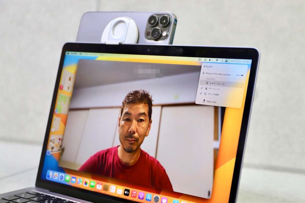 といっても、接続はワイヤレスなので、iPhone自体はどこに固定してもいい。三脚などで立ててもいいし、ご覧のように外部カメラとして使うこともできる。周りの風景を見せたり、説明したいデスクの上のモノを撮影して見せることもできるから、macOS Venturaがローンチされたら、多くの人が利用するようになるに違いない。