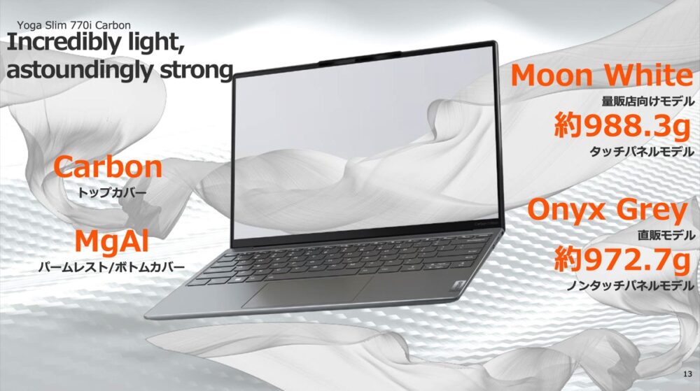 写真のMoon Whiteの量販店向けモデルが約988.3g。Onyx Greyの直販モデルが約972 .7gとなっている。いずれも発表は本日、8月23日、発売が9月2日と発表された。