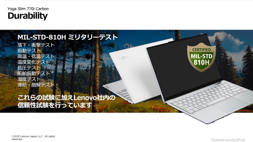 興味深いのは、MIL-STD-810Hミリタリーテストにも合格しているという点。美しい軽量ノートでありながら、タフなヤツでもあるということなのだ。