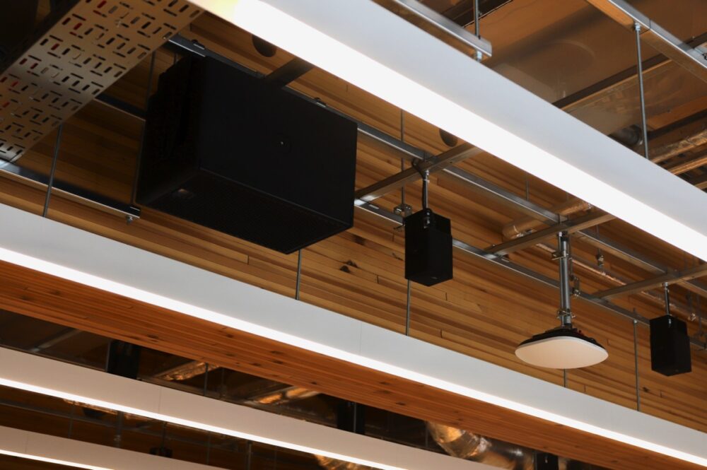 天井部分は、他のストアとは異なり、スケルトン構造になっており、空調、照明、スピーカー、ウーハー、Wi-Fiアクセスポイント(?)などが向き出しになっている。通常の店のように天井にパネルを設けた場合、だいぶ低くなってしまうので、こういう構造にしたのだろう。我々マニアとしては、どんなスピーカーを使っているのか……などを観察できるのが楽しい。