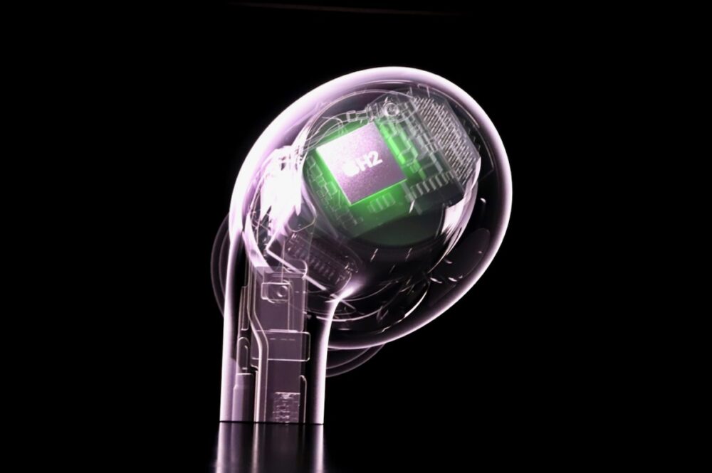 第2世代となったAirPods Proは、本体形状を大きく変えないまま進化、H2チップを搭載し、空間オーディオの性能が向上し、アクティブノイズキャンセリングの性能をさらに向上させ、タッチセンサーで音量のコントロールが行える。
