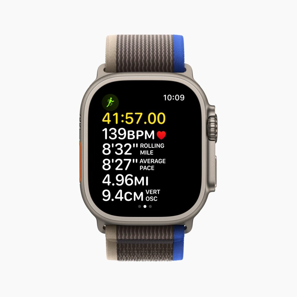 Apple Watch Ultraは、登山や、トレイルランなどの状況下で使うことを想定し、L1に加えて最新の周波であるL5を利用した高精度2周波GPSを利用できる。Apple Watch UltraはこれまでのApple Watchよりあらゆる状況で正確な位置情報を得られるので、正確な距離、ペース、ルートの提供が可能となっている。また、従来より大きくなったディスプレイにより、同時に6つの指標を表示することができる。