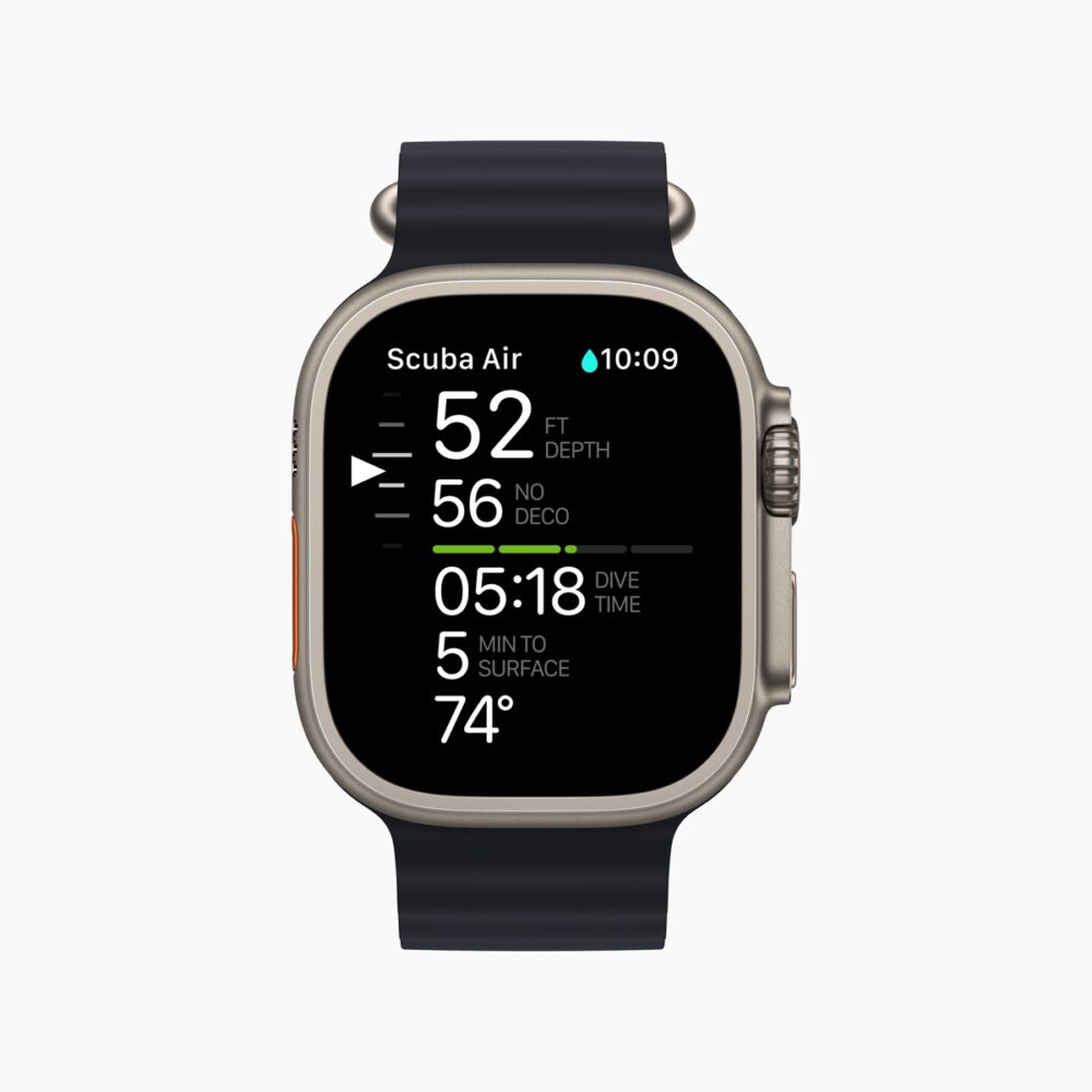 また、Huish Outdoorsと協力して開発された、Oceanic+アプリは、Apple Watch Ultraをダイブコンピュータに変える。今年の秋に提供されるこのアプリは、Bühlmann減圧アルゴリズムを実行し、ダイブプラン、ダイビング指標、視覚と触覚のアラーム、減圧不要限界、浮上速度、および安全停止ガイドなどの機能を備えている。