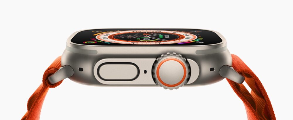 『Ultra』の名は伊達ではない。本体はチタン製。サファイヤクリスタルの画面を守るように、ディスプレイの周りに盛り上がったフチがあり、デジタルクラウンやメインボタンの周りもガッチリと盛り上がったタフな形状になっている。