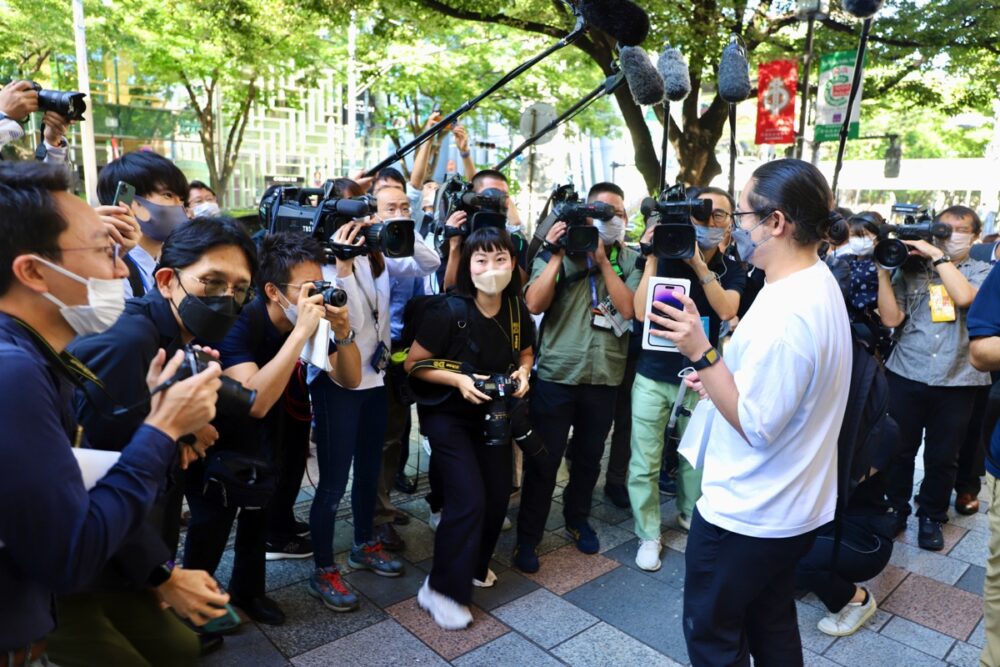 一番に入場した人は、多数の報道陣に囲まれていた。