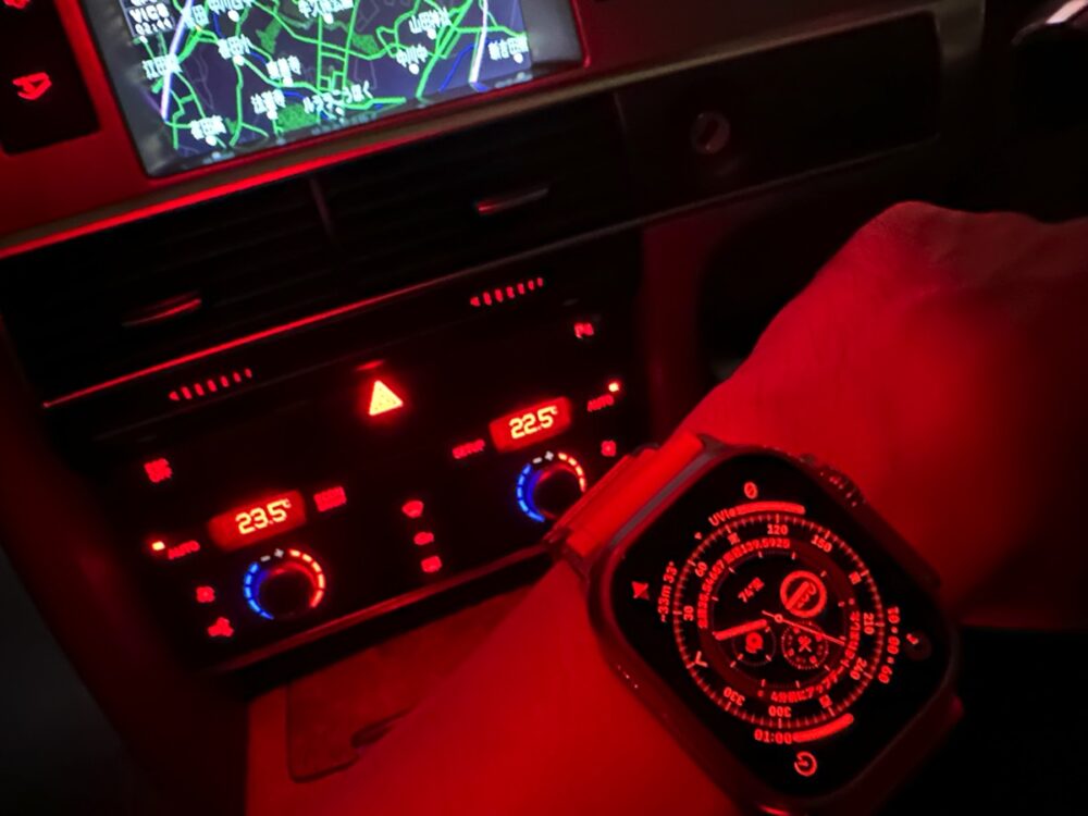 夜間、長時間走る時に、赤いメーターパネルの方が目に優しく見やすいからこうなっているらしいのだが、Apple Watch Ultraのナイトモードも同じ理由なのだろうか?