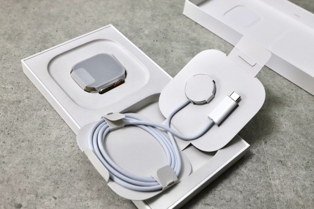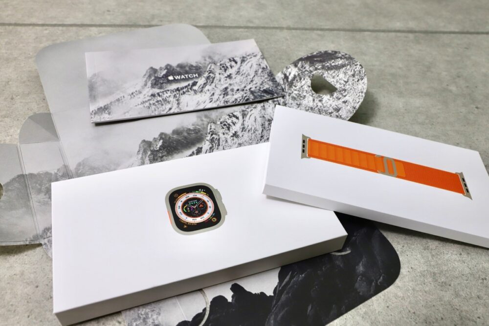 箱を開けると薄紙に包まれたApple Watch Ultraとご対面。同梱されている充電ケーブルは、最新のM2 MacBook Airの充電ケーブルなどと同じような布地で包まれたUSB-C to Apple Watch充電器。一般的なApple Watchより上質な感じだ。