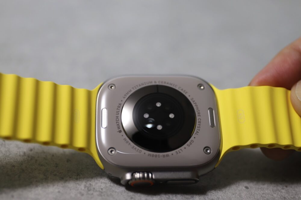 裏面には、第3世代の光学式心拍センサー、心電図も取れる電気心拍センサー、血中酸素ウェルネスセンサーの他に、皮膚温センサーが追加されている……はずだが、どれが皮膚温センサーかは分からなかった。また背面には4つのトルクスネジが配されるようになった。防水の問題などもあるので、まさか開けてみようとは思わないが。