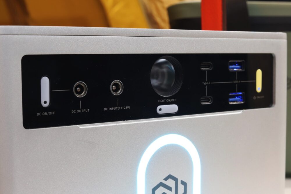BAY 500の本体前面にはDCの出力、入力に加え、PD 100Wまでの出力が可能なUSB-Cポート×2と、USB-Aポート×2が備わっている。また、中央にはLEDライトも用意されている。