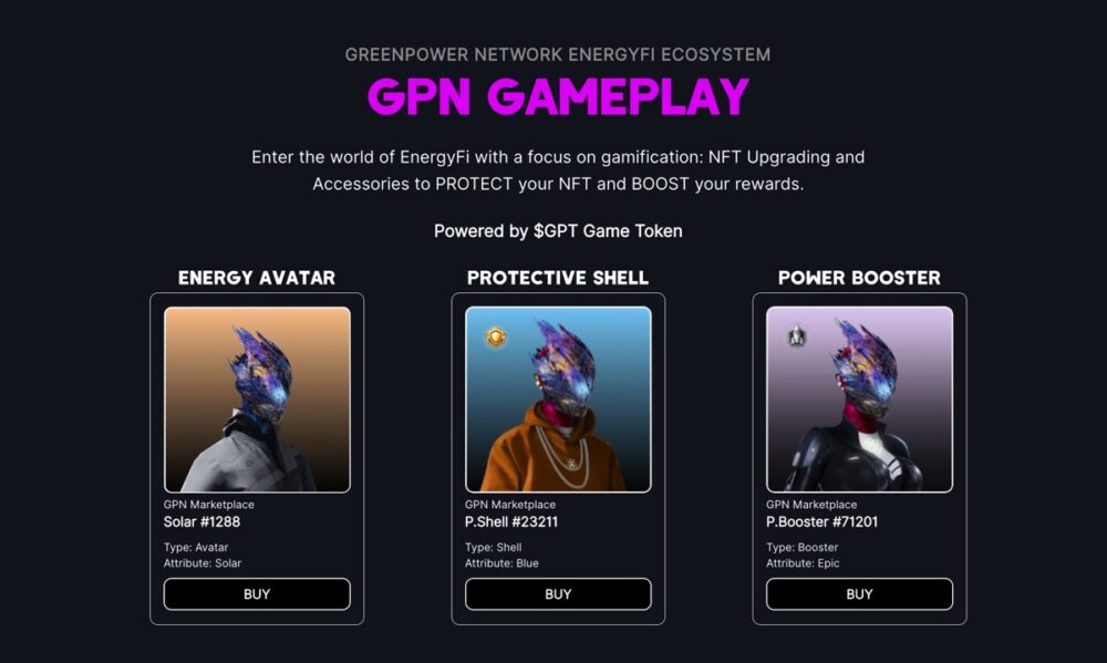 ソーラー、ウィンド、ライトニング、ハイドロ、ニュークリア、ダークマター、バイオマスの7種類のアバターを、トークンを集めることでレベルアップし、シールドやブーストというアイテムを追加して強化していくことができる。GPTではアバターをレベル40まで強化できる。