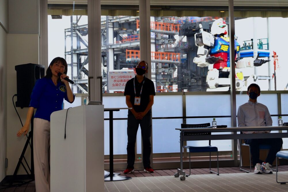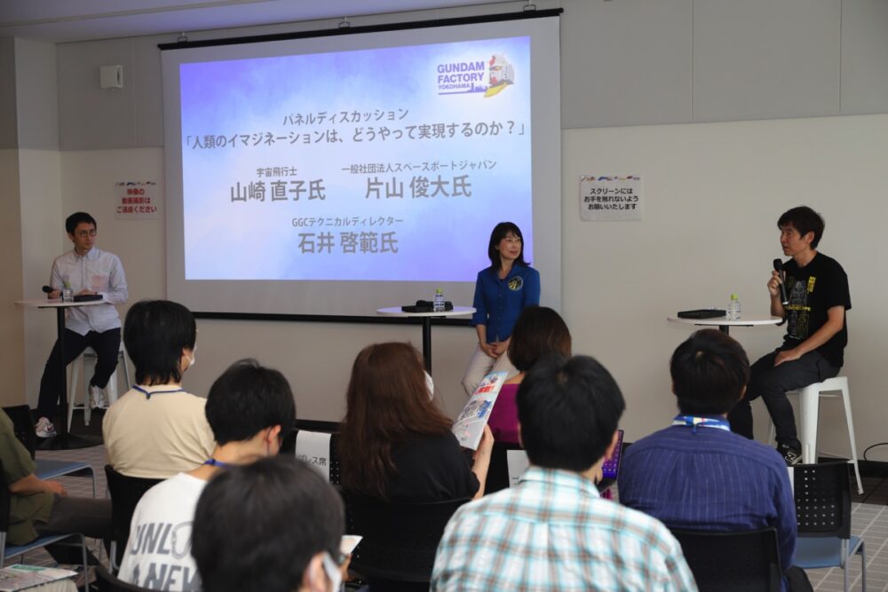 会場は、『GUNDAM FACTORY YOKOHAMA 』にあるイベントルーム。なにしろ、窓の外で実物大ガンダムが動いているのだから、宇宙の未来を語るのにこれほど相応しい場所はないだろう。
