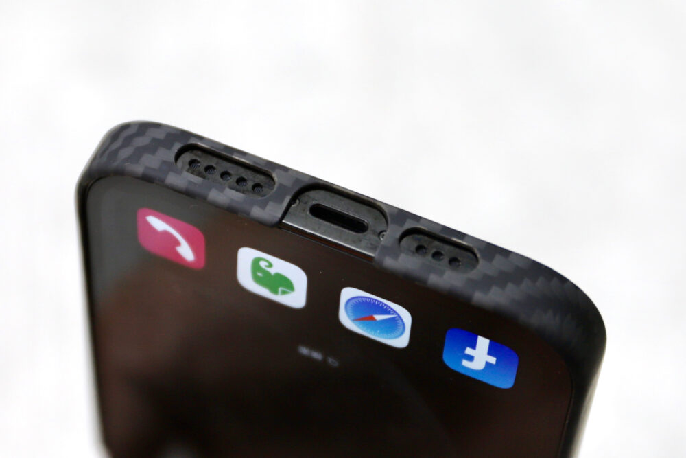 スピーカー部分もちゃんと穴が空いてるし、コネクター部分の切り欠きも広めになっていて、根本が太いコネクターでも装着できる。