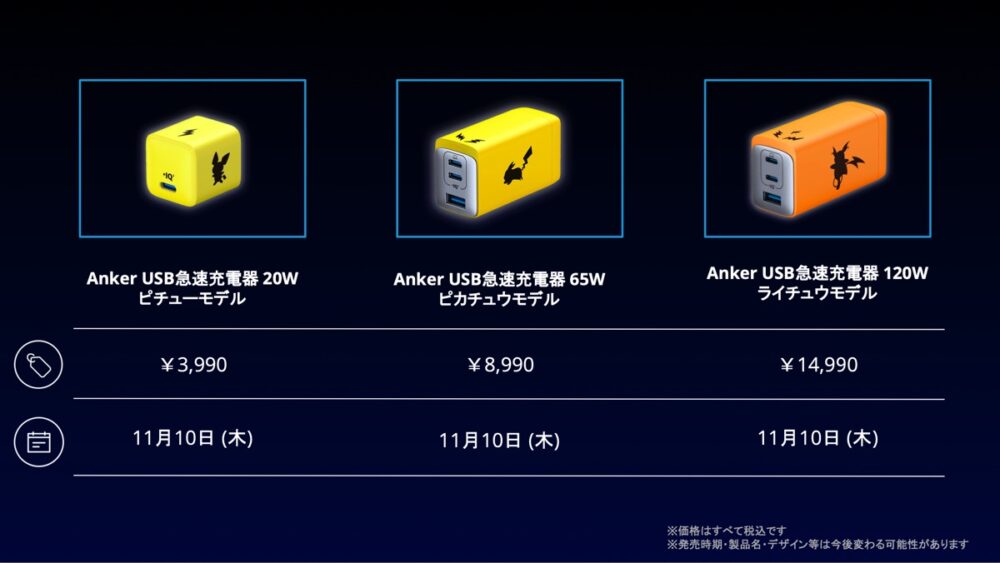 20W、65W、120Wの充電器を、それぞれポケモンのピチュー、ピカチュウ、ライチュウになぞらえた充電器もユニークだ。