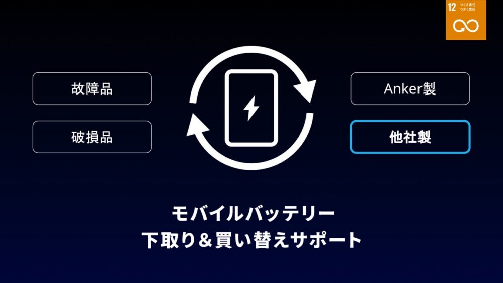 さらに、製品の回収、修理、リサイクルなど、廃棄物を出さないことにも取り組むとのことで、モバイルバッテリーの買い替え、下取りサポートなども行っていくという。なんと、他社製品も引き取るという太っ腹ぶり。