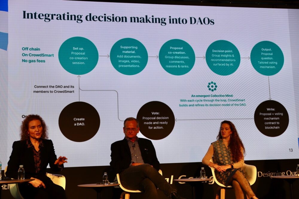 Kim Poleseさんが語ったのは、AIとDAOを組み合わせた地方自治体の意思決定の仕組み。シンシナティ市などではすでに実際に活用されているという。