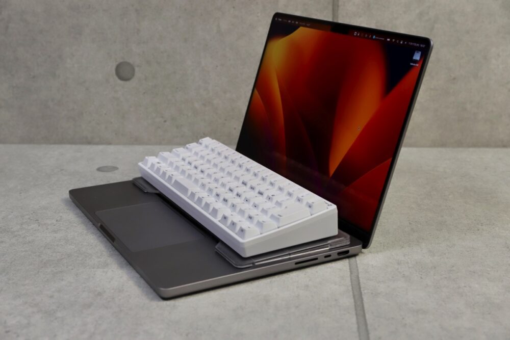 ノートパソコンのキーボードの上に、キーボードが乗っているのは若干奇妙に見えるかもしれないが、HHKBを使い慣れると、短時間といえどもノートパソコンの薄いキーボードの打鍵感では満足できなくなる。