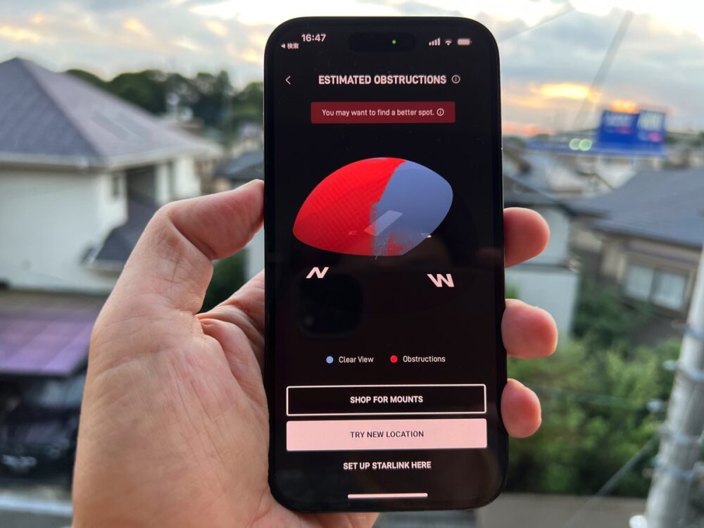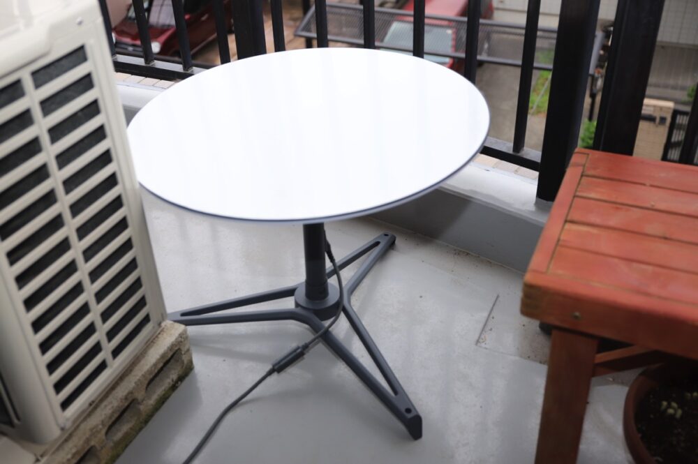 その上、iPhoneに入れているStarlinkアプリには、「この設置場所では十分な通信ができない」的なメッセージが出る。たしかに、このベランダの床に置くと、桟と屋根の間のごくわずかなスペースからしか空を望むことができない。これでは通信できないというのも、考えてみれば納得だ。