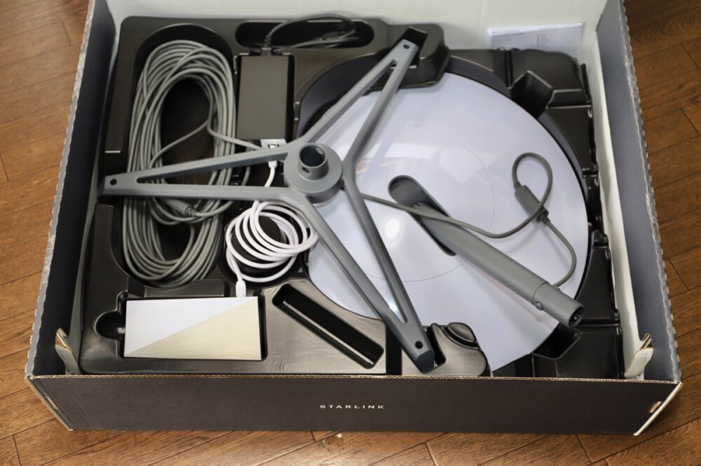 箱の中はこんな感じ。上に乗ってる頂点が3つの星状のものが脚で、下に大きなパラボラアンテナと、ケーブル、そしてWi-Fiルーターと電源ユニットが見える。ケーブルが100ft(約30m)とめちゃくちゃ長いのにも驚くが、これがパラボラアンテナに直接繋がってるので、設置の時には、このケーブルが何気に邪魔だったりする。