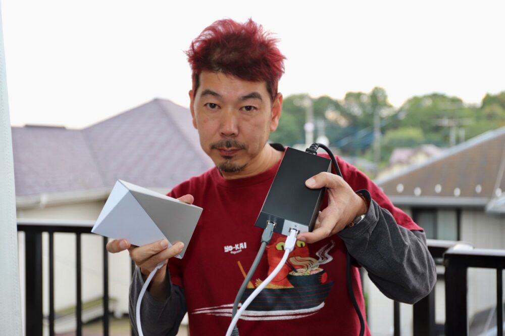 向かって左側に持っているのが、Wi-Fiルーター、三角形を組み合わせた妙なカタチをしている。テスラのサイバートラックを彷彿とさせるデザインだ。床面積が狭いのでよくコケる。右側が、電源ユニット。奥のコネクターに電源、手前左にアンテナ、右にWi-Fiルーターを接続したら準備完了だ。