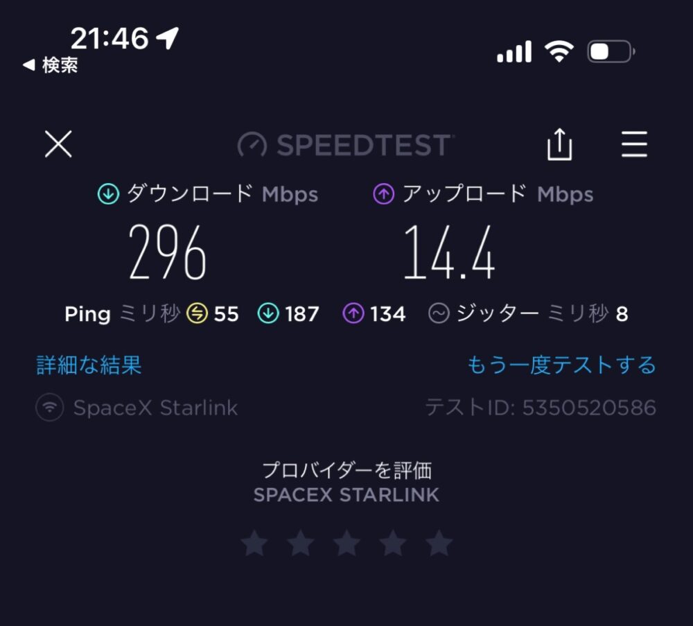 ともあれ、待つこと5分。Starlinkは無事に衛星を掴まえたようで、通信をスタートしてくれた。